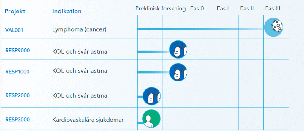 Respiratorius works as a virtual company and hires the necessary expertise and resources as needed, which provides a low and controlled cost base. The company is now focusing on its two main projects; VAL001 in diffuse large B-cell lymphoma (DLBCL) and RESP9000 in COPD and severe asthma.